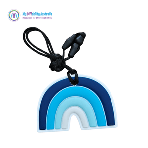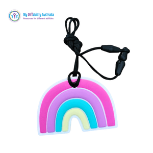 Brighten your day with the Rainbow Chewy Pendant. This fun, large, palm-sized pendant comes in two cheerful colour options. Made from a thick yet bendable chew material, it's perfect for keeping busy mouths and hands happy. Attached to a sleek black cord with a break-away clasp, it’s both playful and practical. Ready to add a splash of colour and comfort wherever you go.