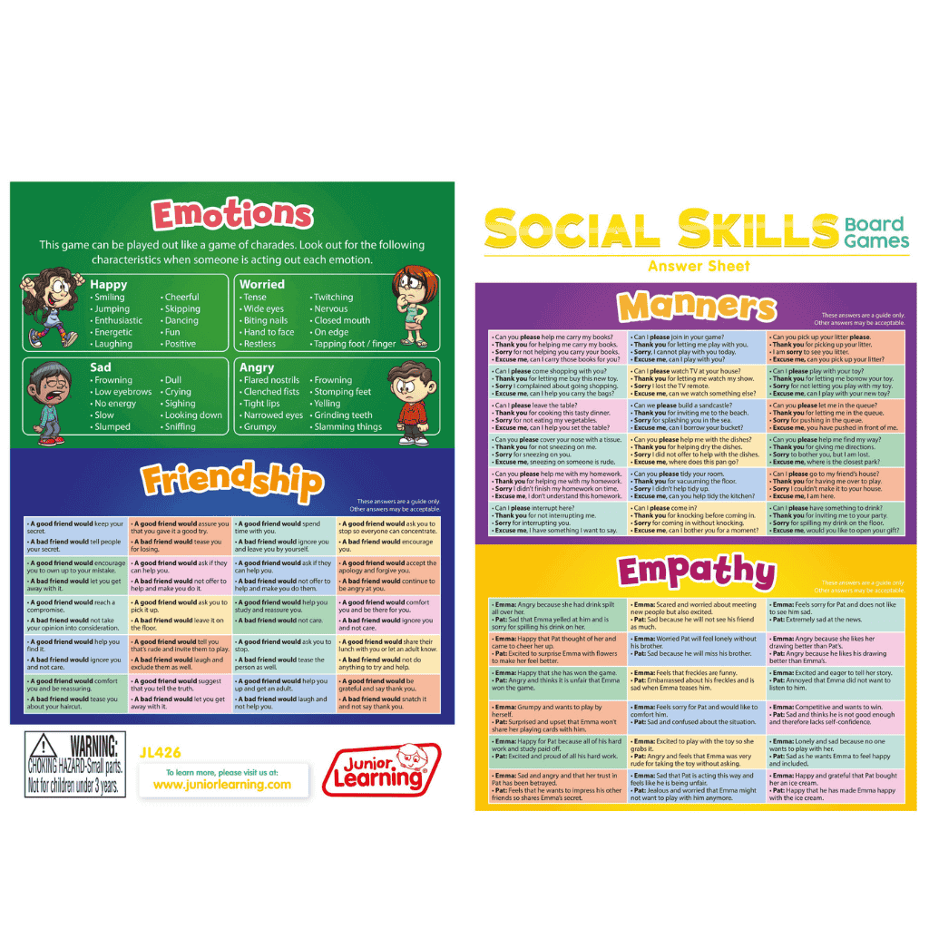This Pack of Social Skills Board Games includes 4 games that will help kids to develop and learn new social skills and behaviours simply by playing, laughing and having fun with friends and family.