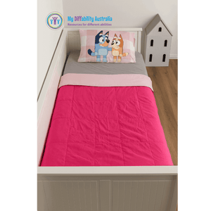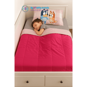 Our weighted blankets are hand made right here in Melbourne. Blankets are filled with Poly Pellets and so are washable. These pink weighted blankets are approximately single bed sized (1 m x 1.5 m) and made from plain fabrics (dark pink on light pink). The sizing is generally best suited to older children and adolescents.
